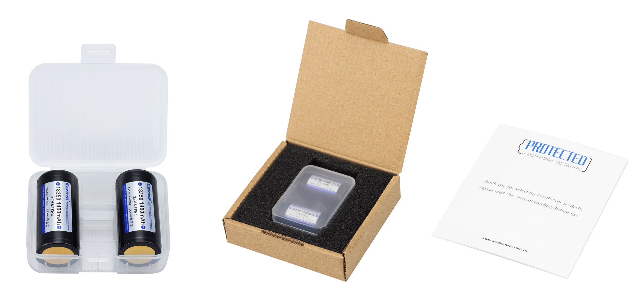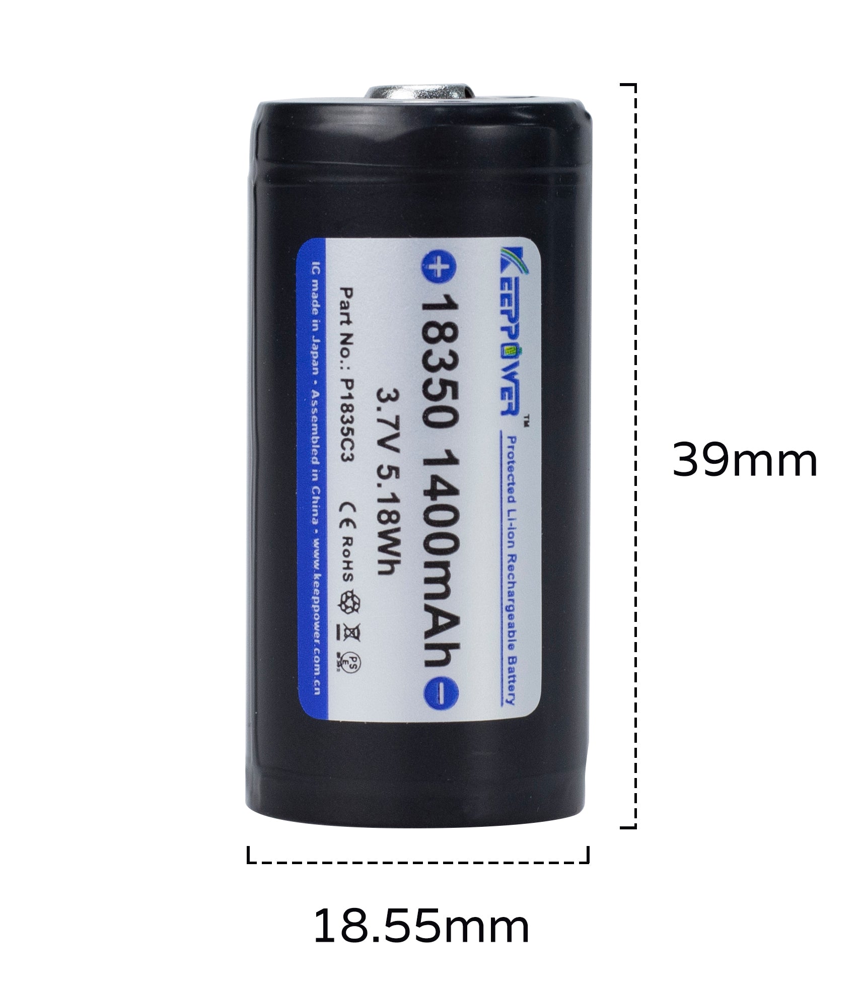 • Button Top Protected 18350 Cell; Size: (D)18.50mm*(L)38.9mm; Capacity: Min. 1380mAh, Normal: 1400mAh; Energy: 5.18Wh.